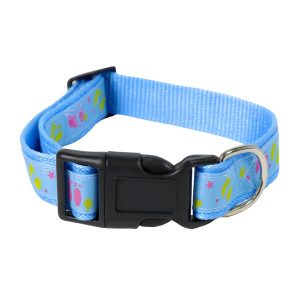 Collar estampado para mascotas, cuenta con hebilla ajustable, anillo tipo D y broche de seguridad. Material: Poliéster Color: Azul claro, rosa, azul oscuro, morado Disponible: Razas pequeñas y medianas