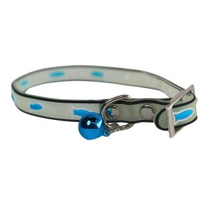 Collar reflectivo que brilla en la oscuridad, cuenta con su broche de seguridad, cascabel y estampados de peces. Material: Plástico Color: Rosado, azul, morado, rojo Disponible: Razas pequeñas.