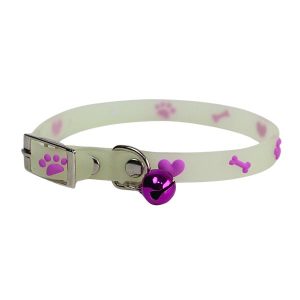 Collar reflectivo que brilla en la oscuridad, cuenta con su broche de seguridad, cascabel y estampado de huesos, huellas y corazones. Material: Plástico Color: Rosado, azul, morado, rojo Disponible: Razas pequeñas.