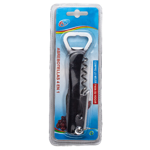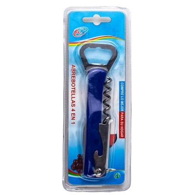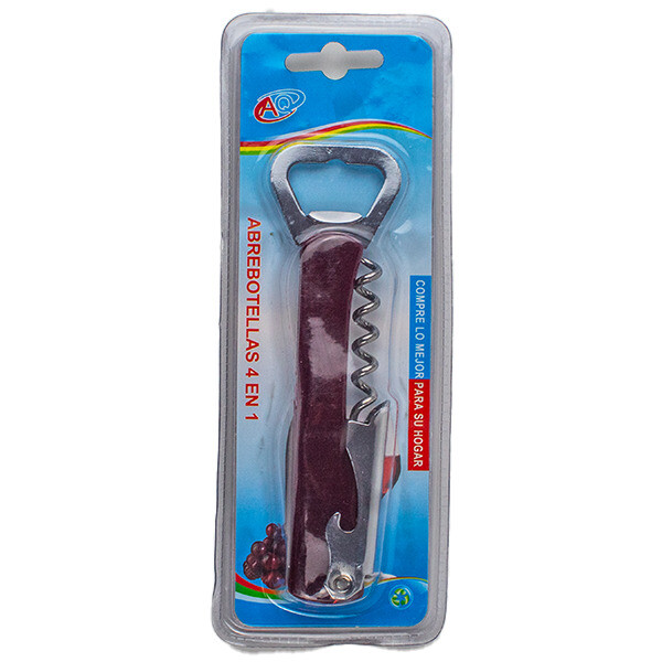 Abridor de botella 4 en 1, cuenta con diferentes funciones para la cocina. Material: Metal Color: Vinotinto, azul, negro