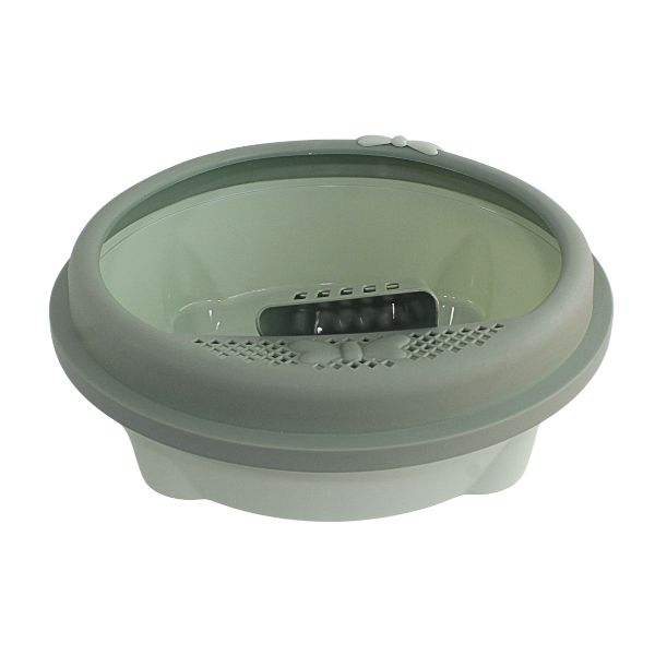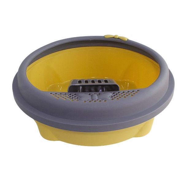Arenera ovalada semicerrada para mascotas. Trae pala. Material: Plástico Color: Verde, naranja, amarillo con morado grisaceo Disponible: Razas pequeñas
