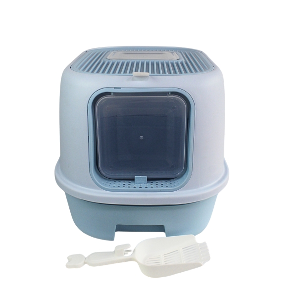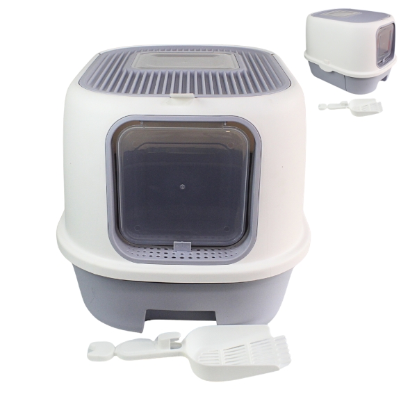 Arenero cubierto con diseño de doble puerta para entrada y salida, cuenta con cajón extraíble y tapa abatible superior para fácil limpieza de residuos. Incluye pala. Material: Plástico Color: Gris, rosado, lila Disponible: Razas pequeñas