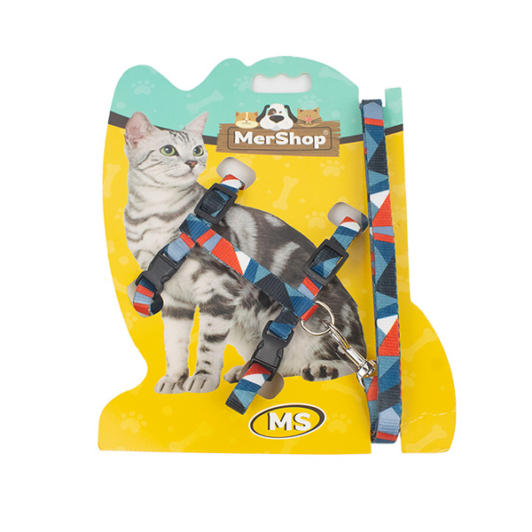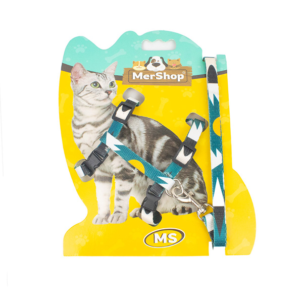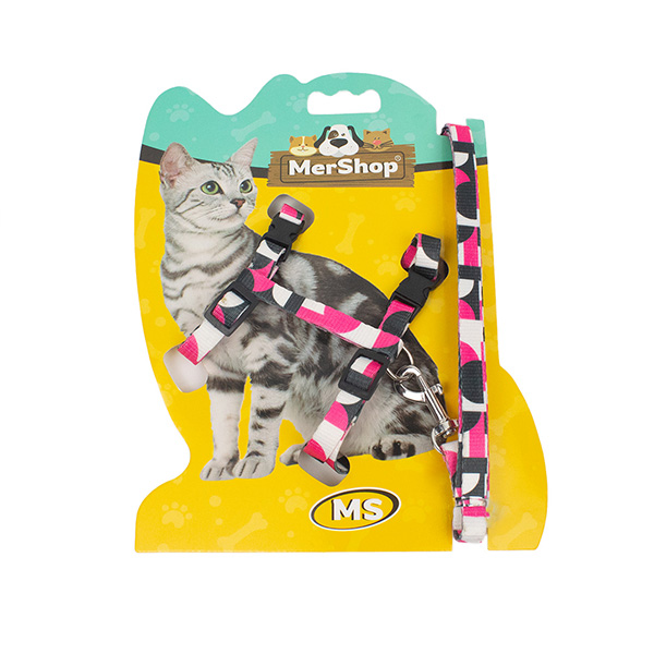 Arnés tipo H estampado, cuenta con hebillas ajustables, broches de seguridad y anillo tipo D para fijar la correa. Material: Poliéster