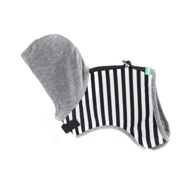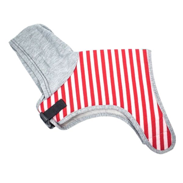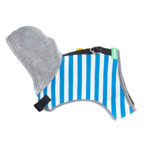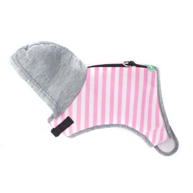 Arnés con diseño a rayas tipo capucha, cuenta con hebillas ajustables, broches de seguridad y anillo tipo D para fijar la correa. Material: Poliéster, metal Color: Rosado, azul, negro, rojo Disponible: Razas pequeñas, mediana, grande. Medidas : TALLA S: CUELLO 30-41 CM TORSO MIN-MAX 41-53 CM PESO MAXIMO – APROX 5-11 KG TALLA M: CUELLO 40-53 CM TORSO MIN-MAX 56-58 PESO MAXIMO – APROX 11-23 KG, TRAILLA 1,20 CM TALLA L: CUELLO 46-66 CM TORSO MIN-MAX 61-76 CM PESO MAXIMO APROX 23-36 KG TALLA XL: CUELLO 70-81 CM TORSO MIN-MAX 70-82 CM PESO MAXIMO – APROX 36-50 KG