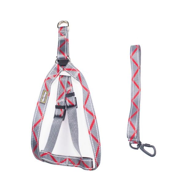 Arnés con rayas zic zac, cuenta con hebillas ajustables, broches de seguridad y correa con mosquetón con pieza de seguridad. Material: Poliéster Color: Gris con beige, gris con rojo, gris con azul Disponible: Razas pequeñas y medianas