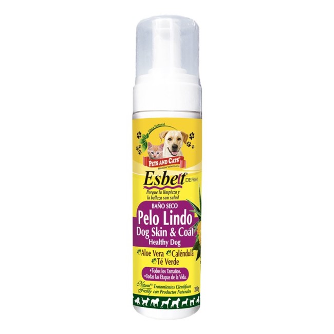 Baño seco Esbelt Derm Pelo Lindo Natural Freshly dermatológicamente formulado para el cuidado de la piel y pelaje, evitando proliferación de bacterias y enfermedades. Ingredientes: Aloe vera, calendula, té verde. Presentación: Frasco x 200 g Disponible: Para perros y gatos de todas las razas y edades.