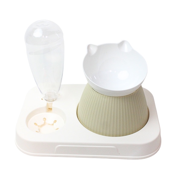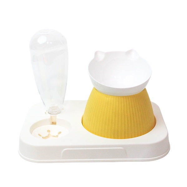 Comedero y bebedero para mascotas, cuenta con base con comedero antirreflujo, botella de agua y comedero elevado de gatito desmontable. Material: Plástico Color: Blanco, amarillo Disponible: Razas pequeñas
