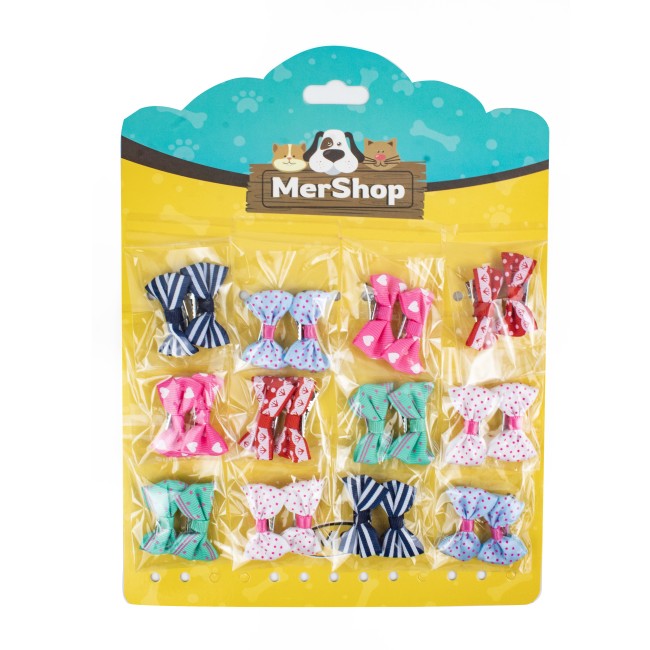 Estiliza a tus mascotas con estos hermosos clip de moño. Cuenta con gancho de metal. Material: Tela, metal Presentación: 12 UND Disponible: Razas medianas y grandes de pelaje largo.