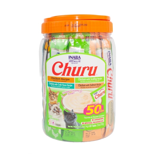 Bombonera de churu, cuenta con 50 unidades tubos de puré de carne lamibles para gatos, surtido en sabores. Ingredientes: Agua, pollo, almidón de tapioca, sabores naturales, sabor nartural de vieiras, goma guar, suplemento de vitamina E, taurina, extracto de té verde. Presentación: 50 UND Disponible: Para gatos de todas las razas