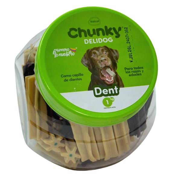 Chunky Delidog dent snacks para perros que además de brindarles una rica experiencia de sabor, también se encargará de cuidar su salud dental, su especial fórmula y textura favorecerá la limpieza de los dientes, retirando el sarro y la placa acumulada. Ingredientes: Almidón de maíz, carne de pollo, sorbitol, agua, aceite de pollo, huevo en polvo, grasa vegetal, queso en polvo, sulfato ferroso, vitamina E, vitamina B3, vitamina A, vitamina K3, vitamina D3, vitamina B5, Vitamina B6.