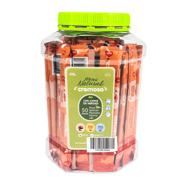 Chunky menú natural cremoso es un suplemento alimenticio para ser suministrado como snack a gatos de todas las razas a partir de los 6 meses. Bombonera x 50 unidades en sabor salmón. Ingredientes: Agua, pulpa de salmón, almidón de papa, goma guar, taurina, color caramelo. Presentación: Bombonera x 50 und Disponible: Gatos de todas las razas a partir de los 6 meses.