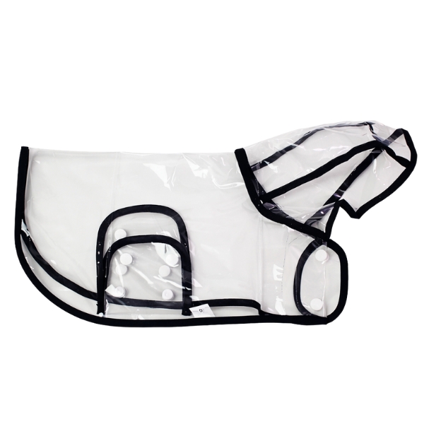 Capa impermeable para mascotas con botones para abrochar, cuenta con orificio para sacar la correa. Material: Plastico Color: Azul, fucsia, negro Disponible: Razas grandes