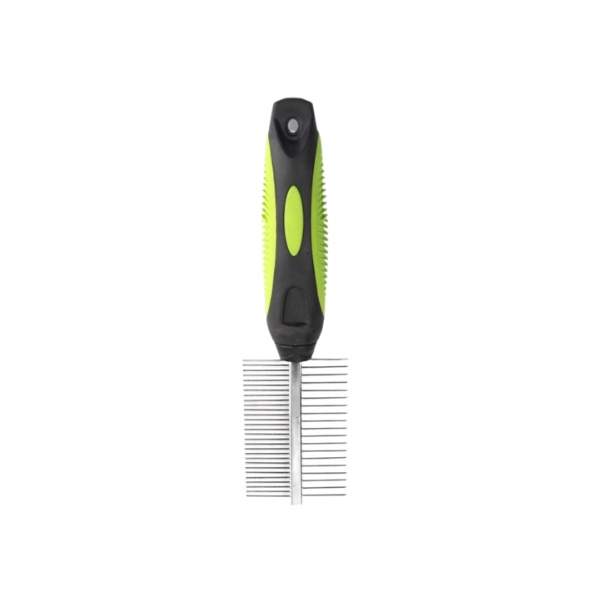 Cepillo con cerdas dobles, cuenta con mango antideslizante. Material: Acero inóxidable, plástico Color: Verde, naranja Disponible: Razas pequeñas, medianas y grandes.