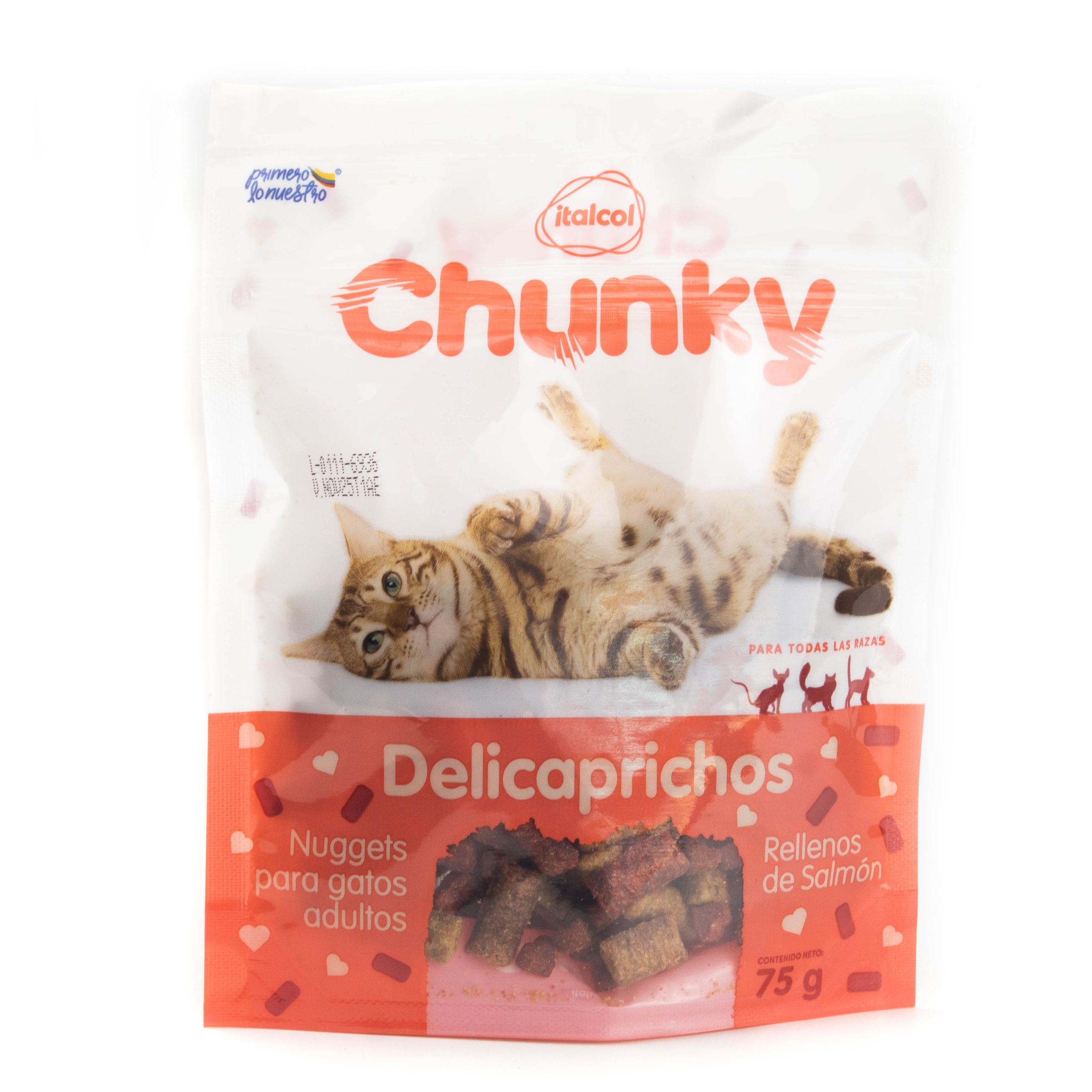 Chunky snacks delicaprichos rellenos de salmón, suplemento indicado como complemento de una nutrición saludable y balanceada. Suministrar como premio a gatos adultos de todas las razas. Ingredientes: Maíz, salmón, arroz, harina de salmón, glúten de maíz, aceite de pollo, sulfato ferroso, vitamnina A, vitamina B12, vitamina D3, vitamina B12, ácido fólico, aceite de romero. Presentación: 75g Disponible: Para gatos adultos de todas las razas.