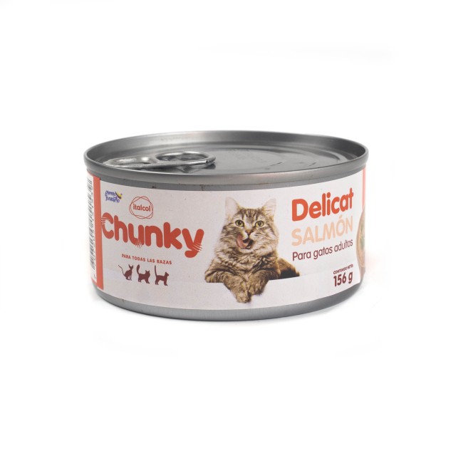 Chunky Delicat salmón en lata contiene carne de salmón garantizada al 100% ademas de ingredientes esenciales como vitaminas, minerales, ácidos grasos y taurina que proporcionan la nutrición completa y balanceada que los gatos requieren. Ingredientes: Salmón, pasta de pollo, agua, harina de trigo, aceite de pollo, proteína concentrada de soya, extracto de levadura, vitamina E, vitamina B3, vitamina B5, vitamina B2, vitamina B12, vitamina B6, vitamina B9, aceite de romero. Presentación: 156g Disponible: Para gatos adultos de todas las razas.