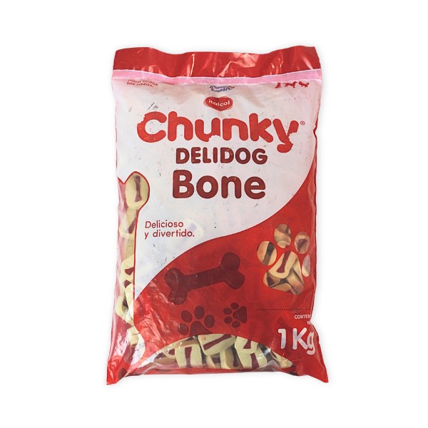 Chunky snack delidog bone es un suplemento alimenticio para perros de todas las razas, recomendado como premio. Aporta calcio para sus dientes, mejora y fortalece los huesos. Ingredientes: Almidón de maíz, gluten de trigo, hidrolizado líquido, hígado de pollo, aceite de pollo, agua, azúcar, hidrolizado en polvo, aroma carne de parrilla, sal, queso en polvo, salvado de trigo, aroma a tocineta, extracto de té verde.