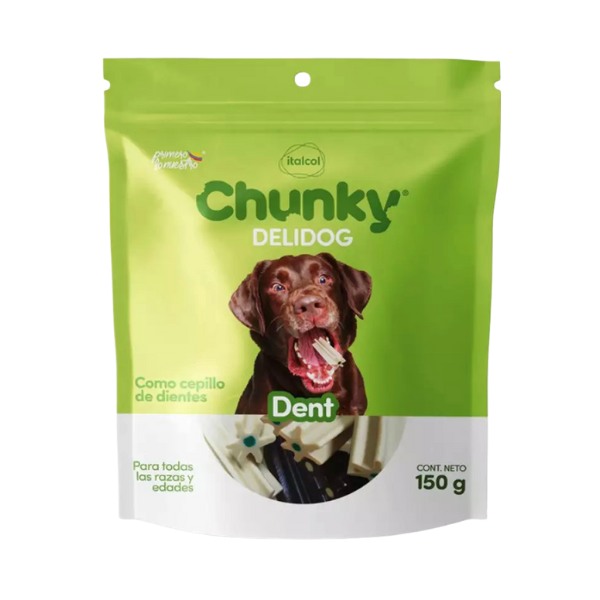 Chunky Delidog dent snacks para perros que además de brindarles una rica experiencia de sabor, también se encargará de cuidar su salud dental, su especial fórmula y textura favorecerá la limpieza de los dientes, retirando el sarro y la placa acumulada. Ingredientes: Almidón de maíz, carne de pollo, sorbitol, agua, aceite de pollo, huevo en polvo, grasa vegetal, queso en polvo, sulfato ferroso, vitamina E, vitamina B3, vitamina A, vitamina K3, vitamina D3,vitamina B5, Bitamina B6. Presentación: 150g Disponible: Perros de todas las razas y edades.
