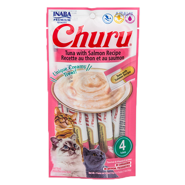 Suplemento alimenticio de consistencia cremosa, sabrosa y bajo en calorías. Churu está pensado como un premio y no debe administrarse como una comida completa. Ingredientes: Agua, atún, tapioca, salmón, sabor a atún natural, Taurina, extracto de té verde. Presentación: 4 UND X 14GR Disponible: Para gatos de todas las razas a partir de los 3 meses de edad.