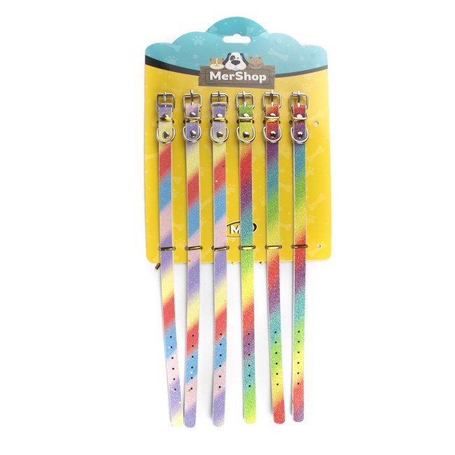 Collar escarchado multicolor, cuenta con 6 puntos para ajustar a la medida y anillo tipo D para fijar la correa. Material: Poliéster, metal Color: Disponible en la foto. Disponible: Razas pequeñas. Medidas: Largo 37 cm * Ancho 1.5 cm