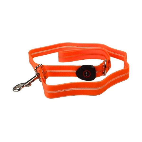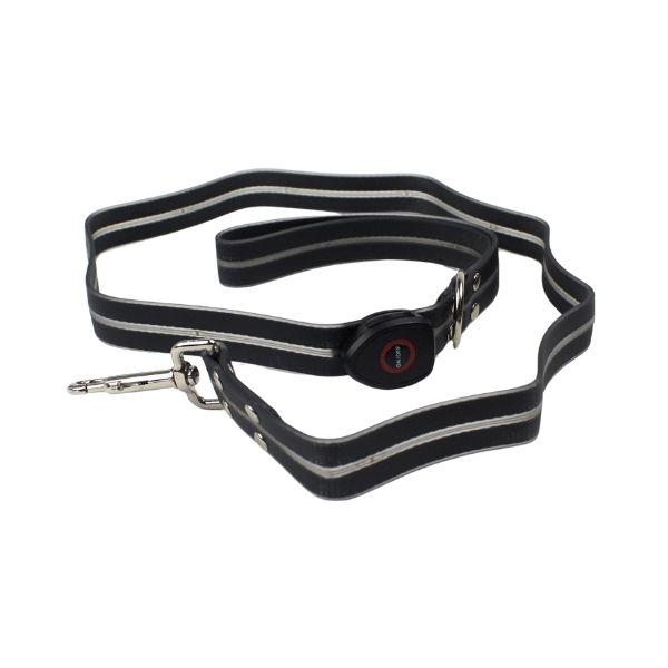Correa con luz led, cuenta con mosquetón de seguridad, anillo tipo D, tres modos de iluminación y cable USB de carga.