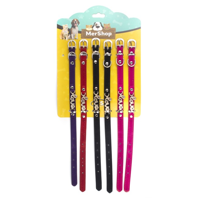 Collar con taches, cuenta con 5 puntos para ajustar a la medida, pieza decorativa “LOVE” y anillo tipo D para fijar la correa. Material: Cuerina, metal Color: Rojo, rosado, morado, negro Disponible: Razas pequeñas. Medidas: Largo 37.5 cm * Ancho1.5cm