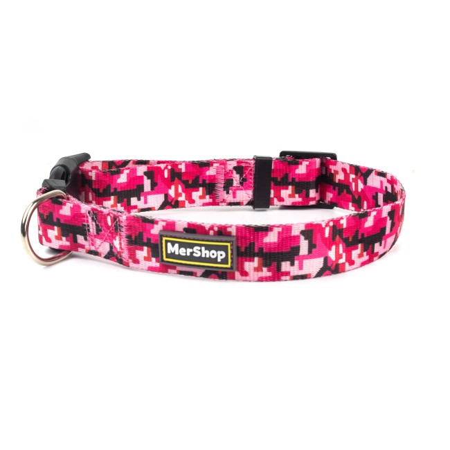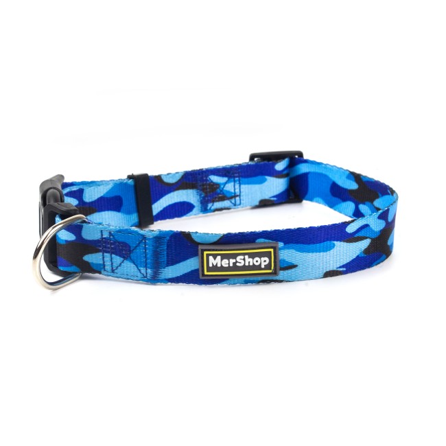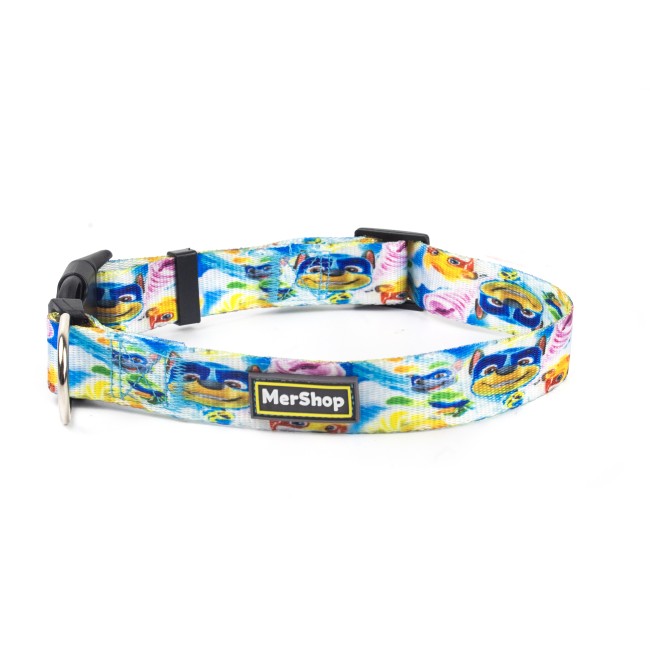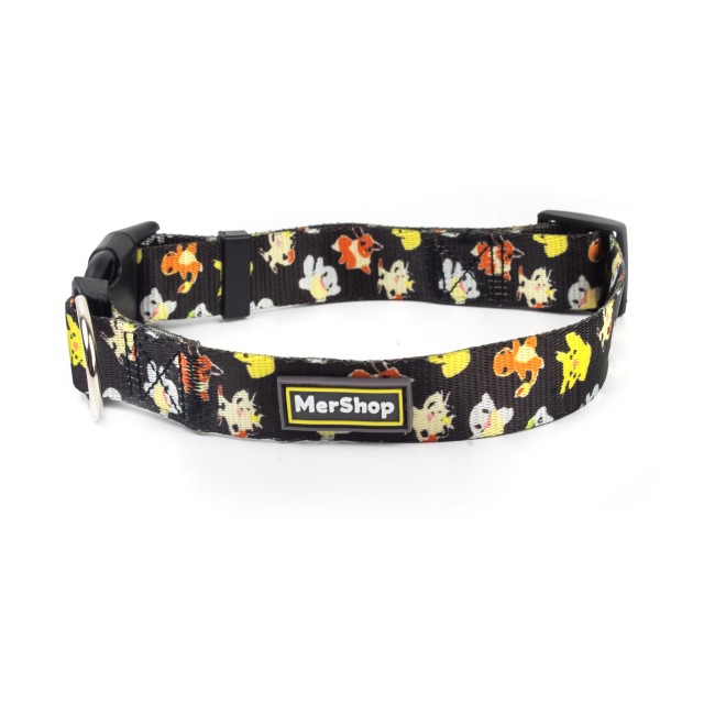 Collar estampado, cuenta con hebillas ajustables, broche de seguridad y anillo tipo D para fijar la correa. Material: Poliéster, metal