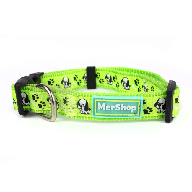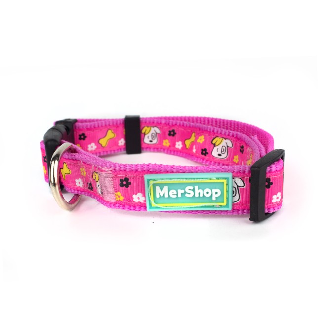 Collar estampado, cuenta con hebillas ajustables, broche de seguridad y anillo tipo D para fijar la correa. Material: PoliƩster, metal Color: Negro, verde, rojo, rosado Disponible: Razas medianas y grandes Medidas: TALLA L : Largo 45cm * Ancho35cm TALLA XL: Largo 49cm * Ancho38cm