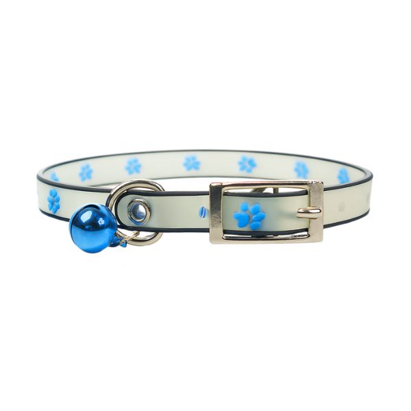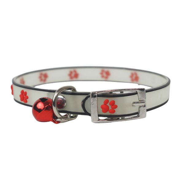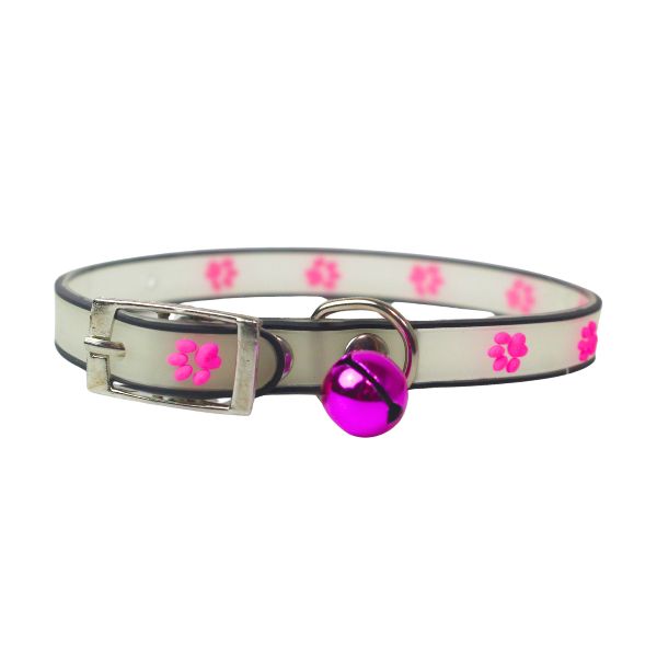Collar reflectivo que brilla en la oscuridad, cuenta con su broche de seguridad, cascabel y estampado de huellas. Material: Plástico Color: Rosado, azul, morado, rojo Disponible: Razas pequeñas.
