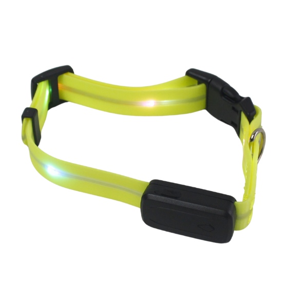 Collar con luz led, cuenta con broche de seguridad, hebilla ajustable, anillo tipo D para fijar la correa, tres modos de iluminación y cable USB de carga. Material: Sintético Color: Negro, naranja, verde Disponible: Razas pequeñas y medianas