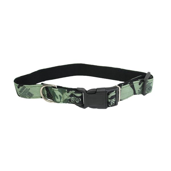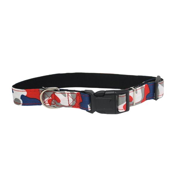 Collar con estampado militar, cuenta con hebillas ajustables, broches de seguridad y anillo tipo D para fijar la correa. Material: Poliéster Color: Café con verde, verde con negro, azul con rojo Disponible: Razas grandes