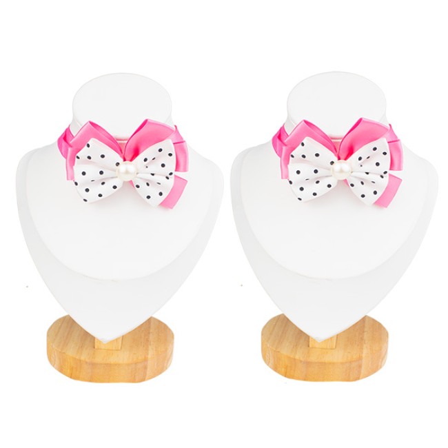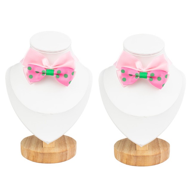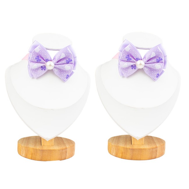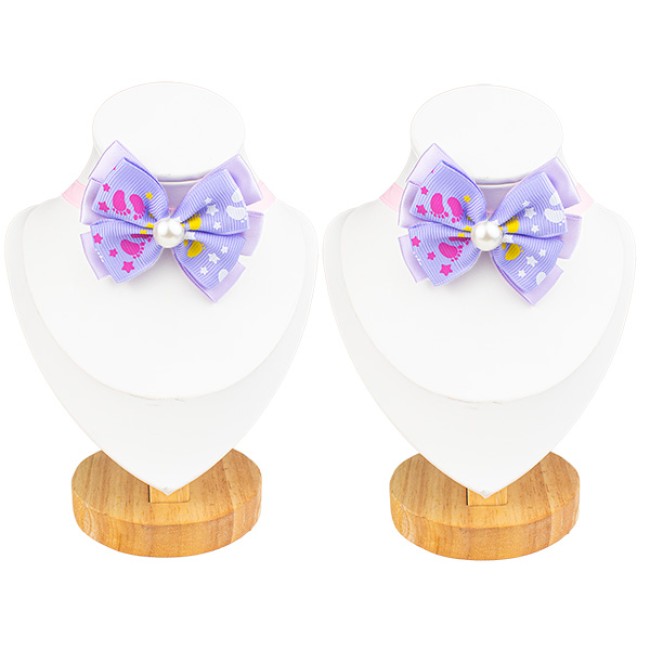 Paquete x 2 collares con moño estampado, cuenta con hebilla ajustable y broche de seguridad. Material: Poliéster Color: Lila huella, lila moño, rosado con verde, fucsia, azul claro, fucsia con blanco, blanco con puntos rosados. Disponible: Razas pequeñas.