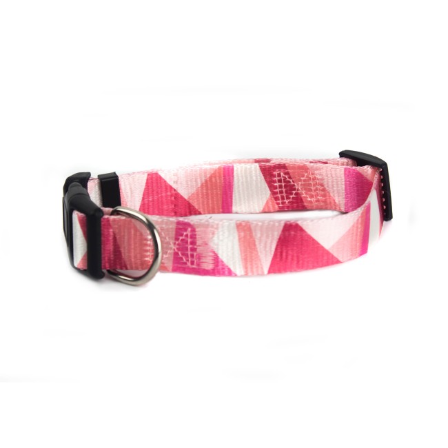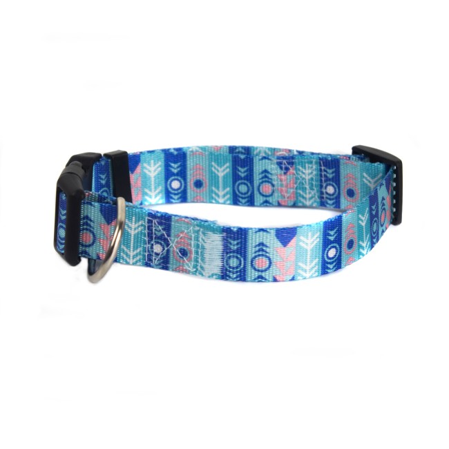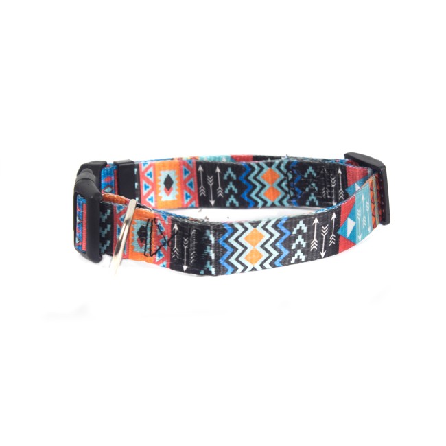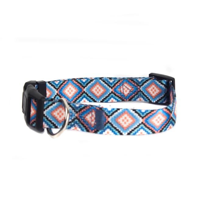 Collar estampado para mascotas, cuenta con broche de seguridad y anillo tipo D para fijar la correa. Material: PoliƩster Color: Rosado, negro, azul, azul con rosa, verde militar. Disponible: Razas grandes.
