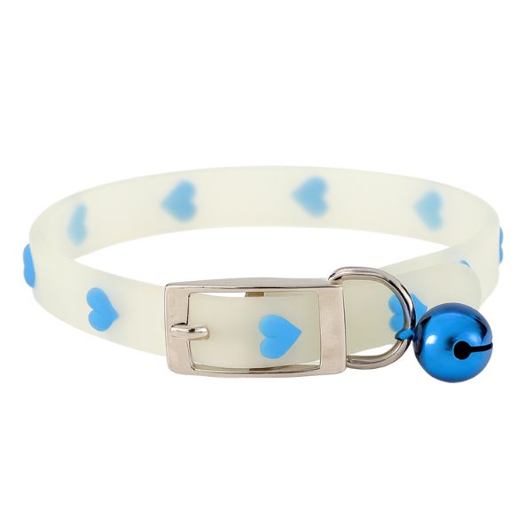Collar reflectivo que brilla en la oscuridad, cuenta con su broche de seguridad, cascabel y estampado corazones. Material: Plástico Color: Rosado, azul, morado, rojo Disponible: Razas pequeñas.