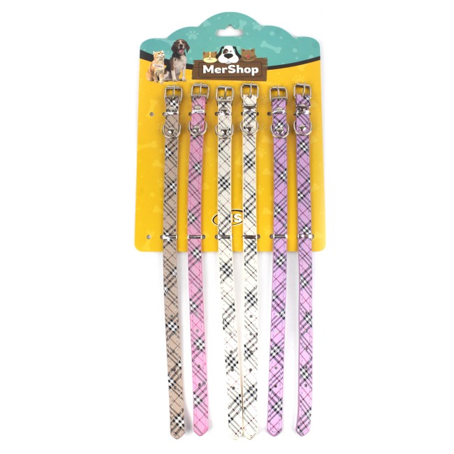 Collar con estampado de tartán, cuenta con 4 puntos para ajustar a la medida y anillo tipo D para fijar la correa. Material: Cuerina, metal Color: Café, beige, rosado Disponible: Razas pequeñas. Medidas: Largo 37cm * Ancho1.5cm