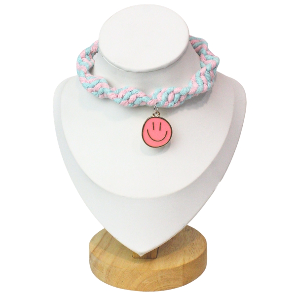 Collar de cuerda trenzada con dije de carita feliz. Material: Poliéster Color: Verde con amarillo, amarillo con rosa, rosa con azul Disponible: Razas pequeñas