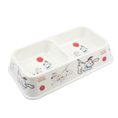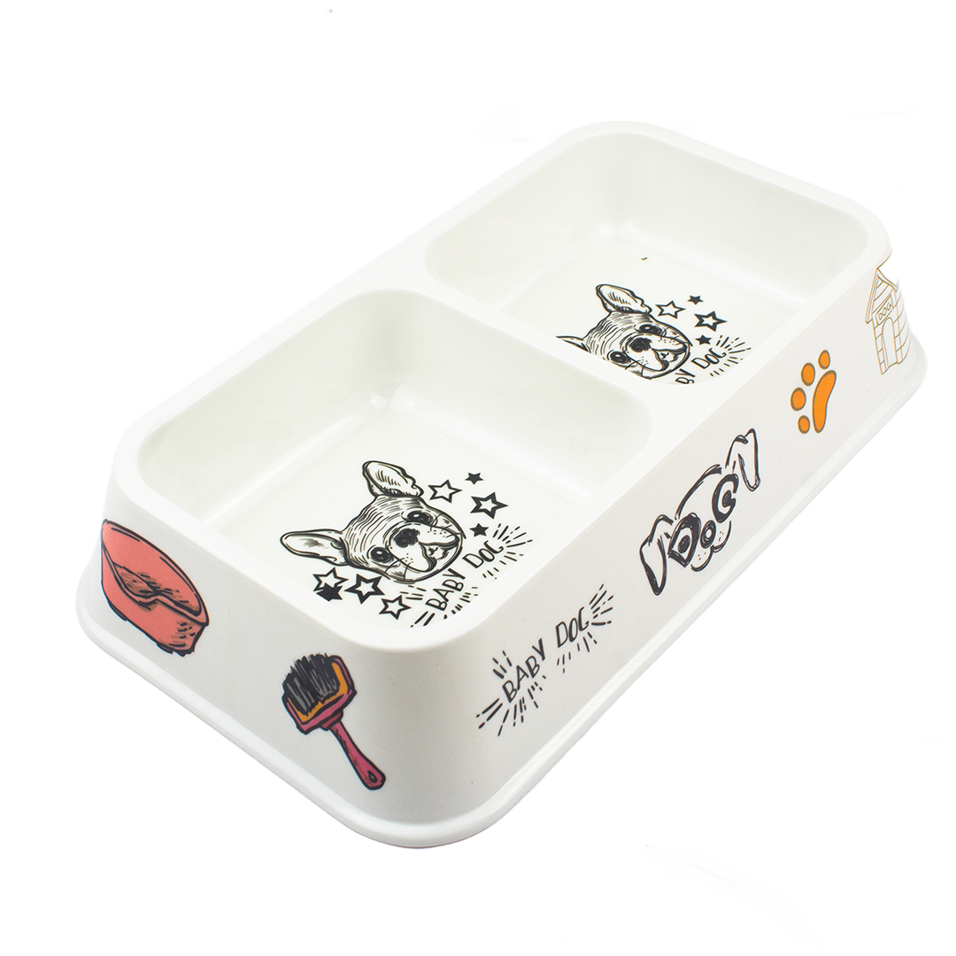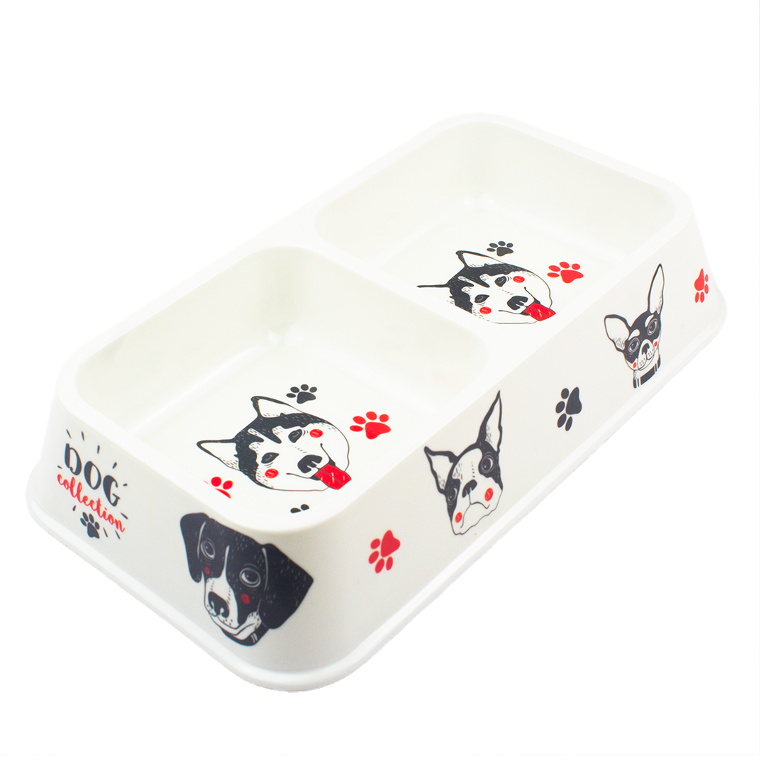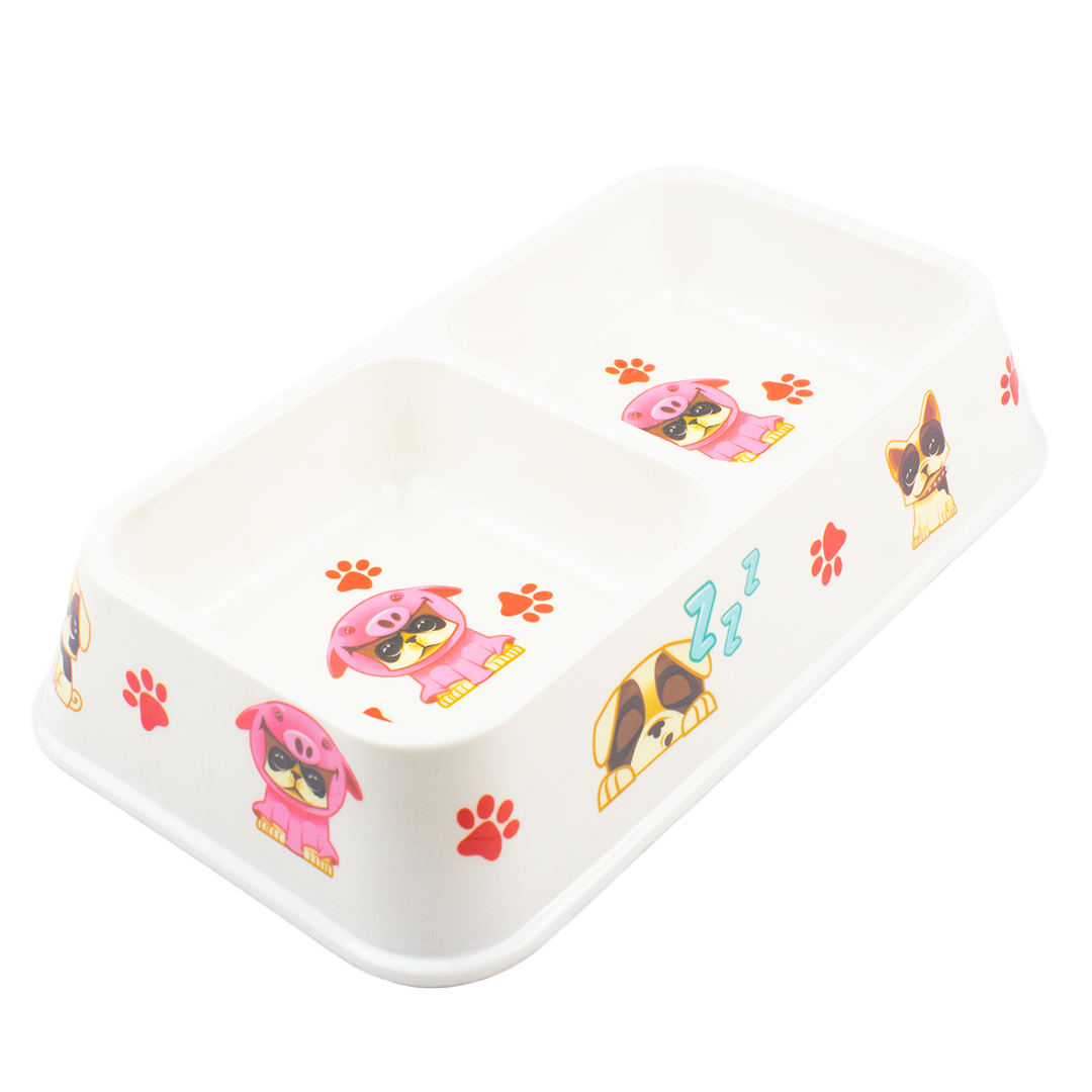 Comedero cuadrado doble con estampado. “Material: Melamina Estampado: Perro disfraz de cerdo huellas rojas, bulldog frances, dalmata. Disponible: Razas pequeñas”