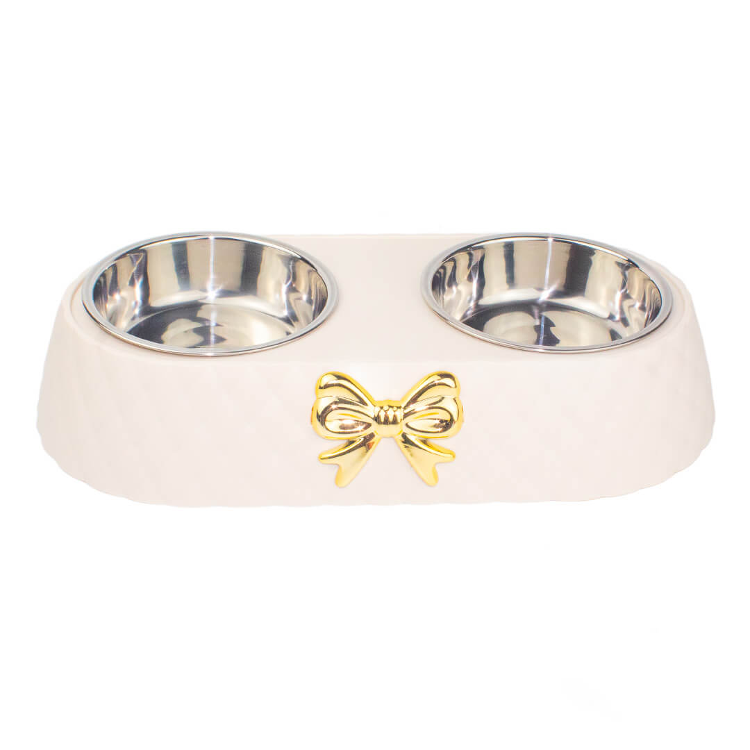 Comedero doble para mascotas cuenta con moño decorativo, bowls removibles y piezas antideslizantes. Material: Plástico, metal