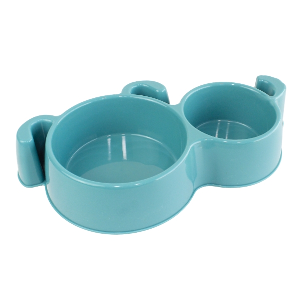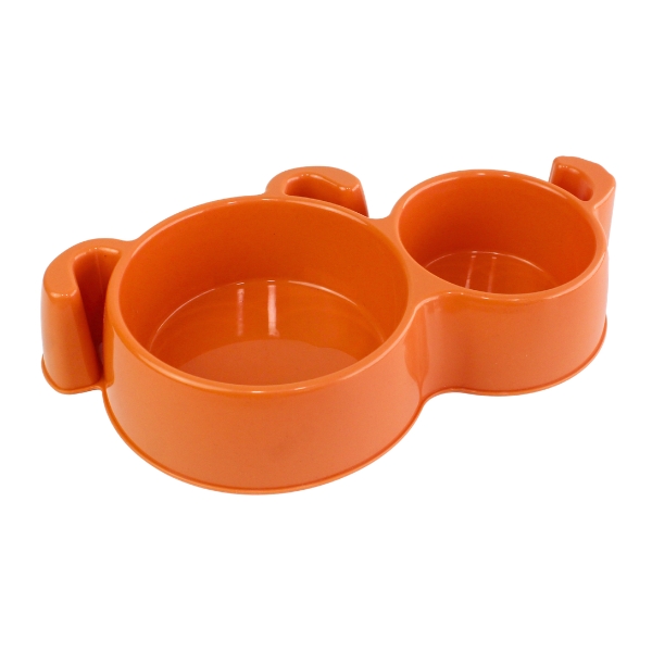 Comedero doble con diseño de perro. Material: Plástico Color: Naranja, verde Disponible: Razas pequeñas