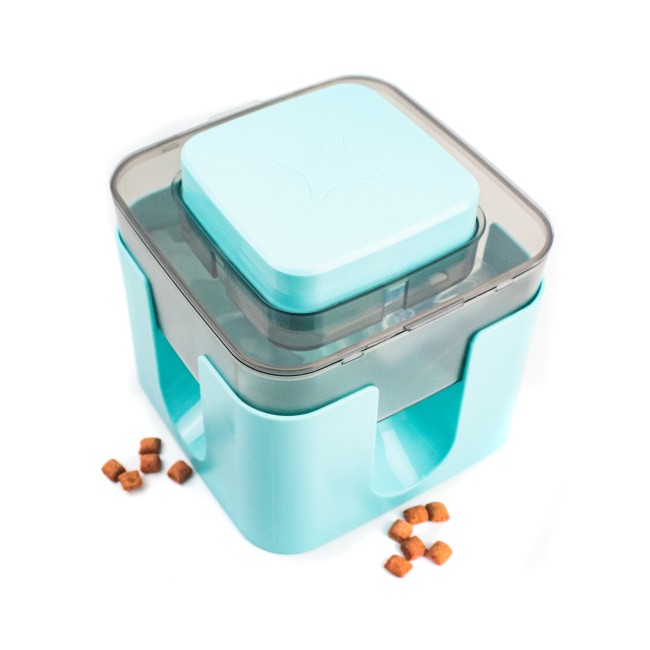 Comedero multifuncional, cuenta con cuatro aberturas por las que saldrá el alimento oprimiendo el botón del medio. Reduce la ansiedad y mejora la inteligencia de las mascotas. Material: Plástico Color: Blanco, azul, rosado, verde Disponible: Razas pequeñas, medianas y grandes.