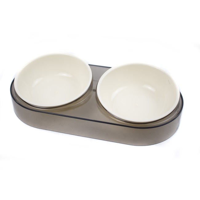 Comedero doble para mascotas semi-elevado. Material: Plástico Color: Blanco, morado Disponible: Razas pequeñas