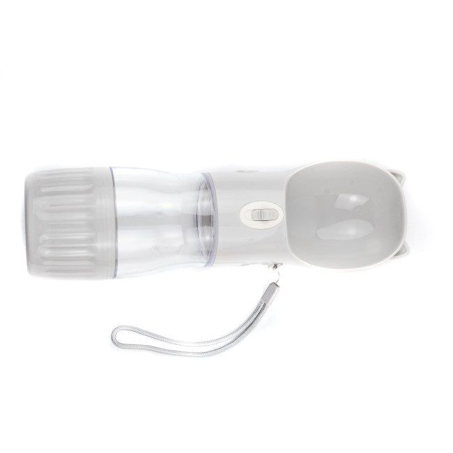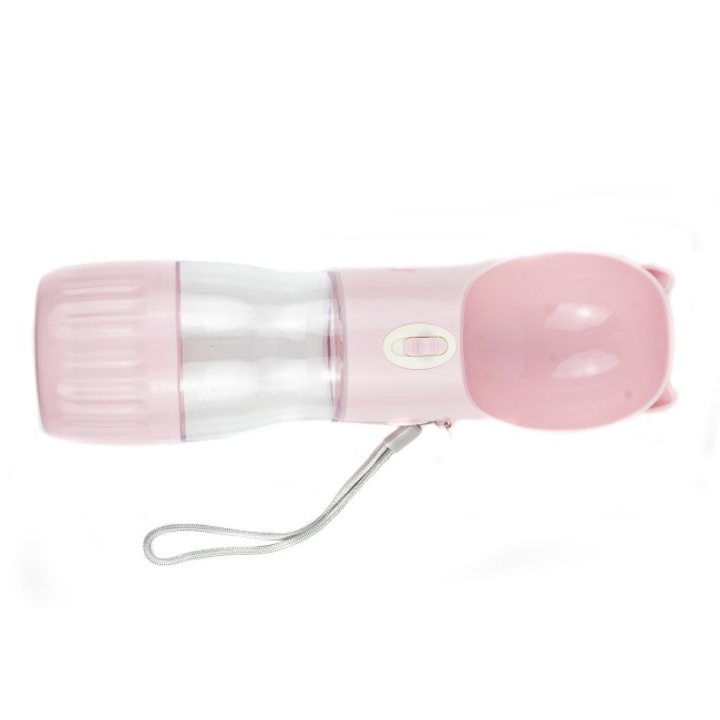 Bebedero portatil, cuenta con interruptor que al ser oprimido ira expulsando el agua, base removible para guardar snacks y cordón de tela para mejorar su transporte. Material: plástico Color: Rosado, amarillo, morado, gris Disponible: Razas pequeñas Medidas: Largo 22cm*Ancho 8cm