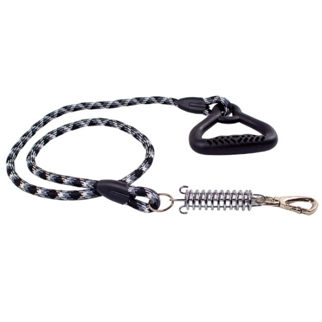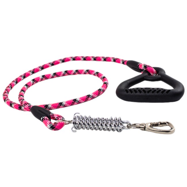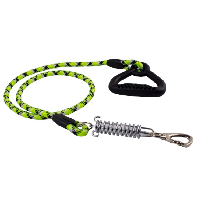 Correa bicolor con resorte antitirones y mango macizo. Material: PoliƩster, metal Color: Verde, rosado, azul, negro Disponible: Razas medianas y grandes