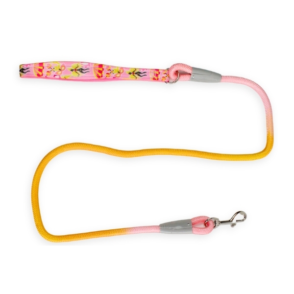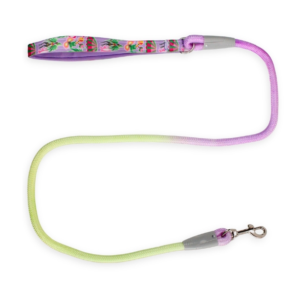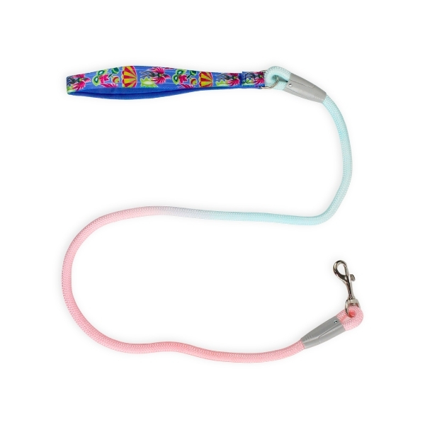 Correa con mango estampado, cuenta con mosquetón de metal. Material: Poliéster Color: Lila, rosado, azul Disponible: Razas pequeñas, medianas y grandes