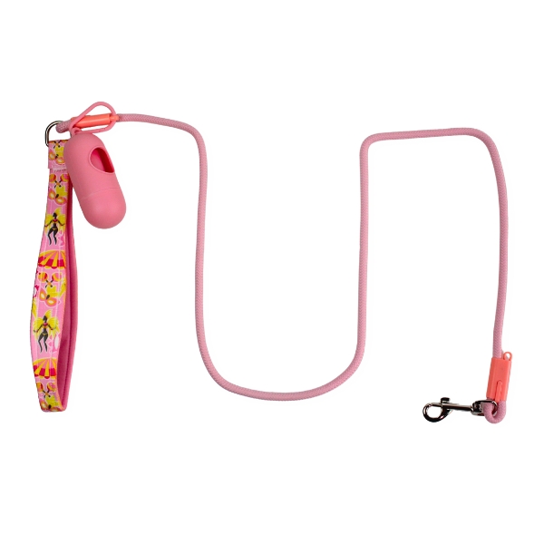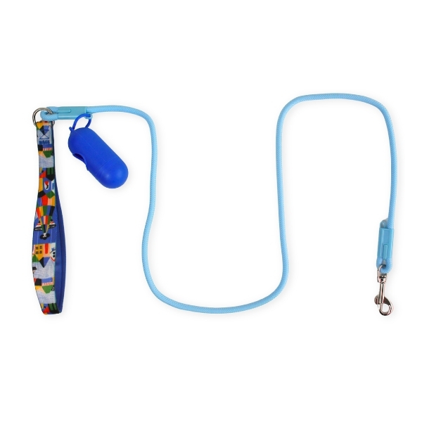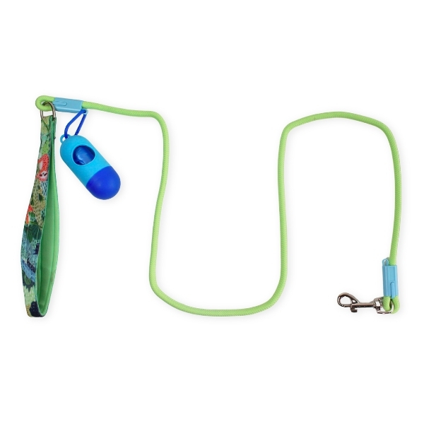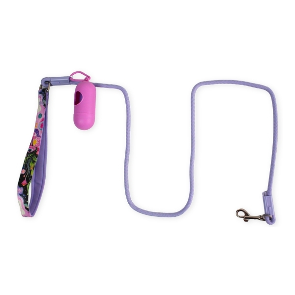 Correa con mango estampado, cuenta con portabolsa y mosquetón de metal. Material: Poliéster Color: Lila, rosado, verde, azul Disponible: Razas pequeñas, medianas y grandes