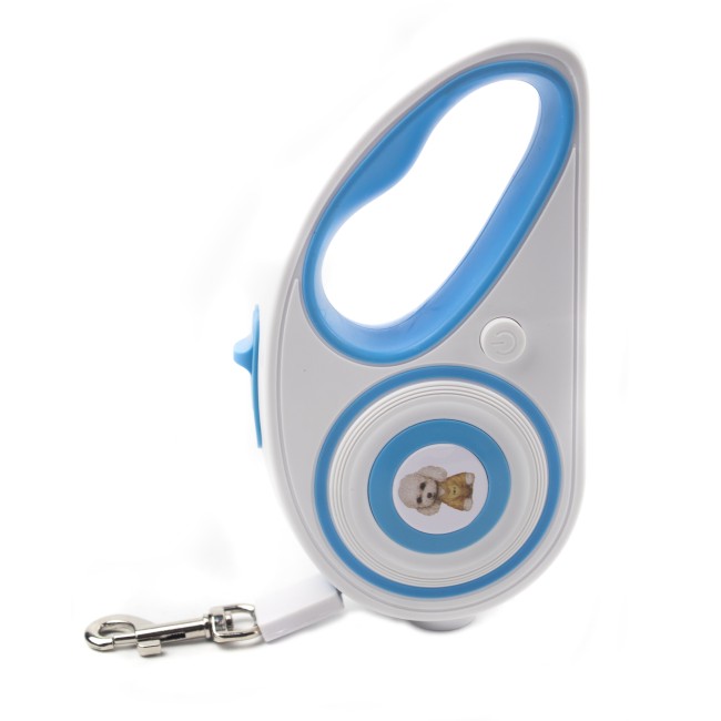 Correa retractil con luz led 3M, cuenta con botón para fijar o soltar la correa e interruptor en el costado para encerder la luz led. Funcionamiento de luz led solo con pilas AAA. Material: Plástico Color: Blanco con azul, rosado con azul, negro con azul. Disponible: Razas pequeñas