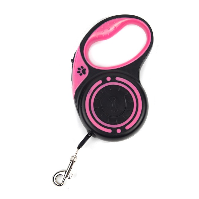 Correa retractil, cuenta con estampado de huella y botón para fijar la correa. Trae 3M de cuerda. Material: Plástico, metal Color: Negro, rosado, azul Disponible: Razas pequeñas, Medianas