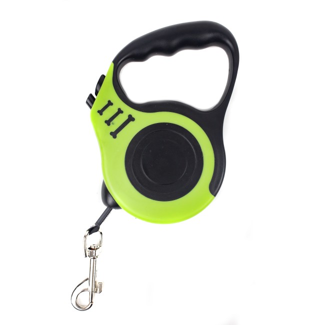 Correa retractil con estampado de huesitos, cuenta con botones para fijar la correa o soltarla. Trae 5M de cuerda. Material: PVC, metal Color: Verde, azul, rojo, amarillo, rosado Disponible: Razas pequeñas y medianas de hasta 20 kg. Medidas: Talla M Largo 5M * 20kg
