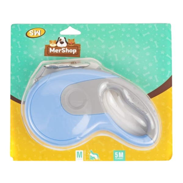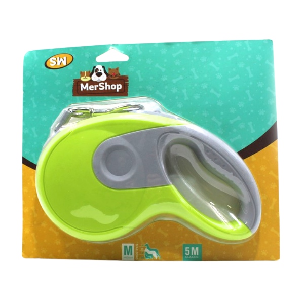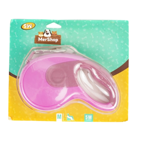 Correa retractil con mango antideslizante. Trae 5m de cuerda. Material: PVC, metal Color: Rosado, verde, azul, naranja Disponible: Razas medianas de hasta 20kg Medidas: 5mts * Ancho 2 cm