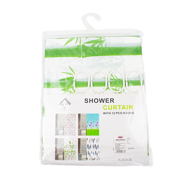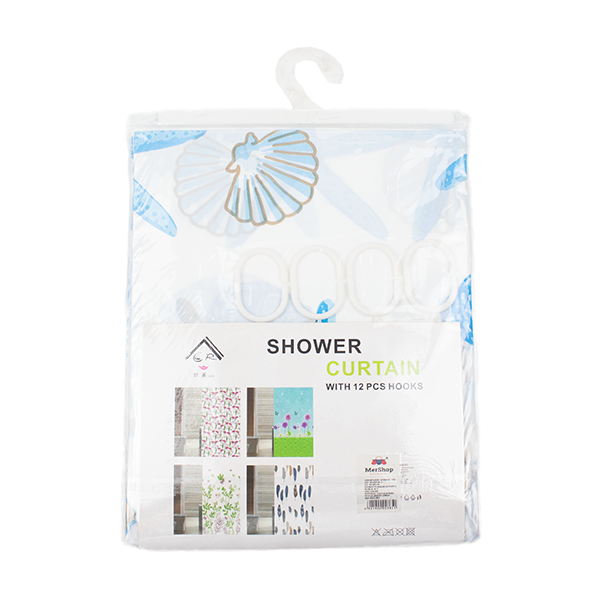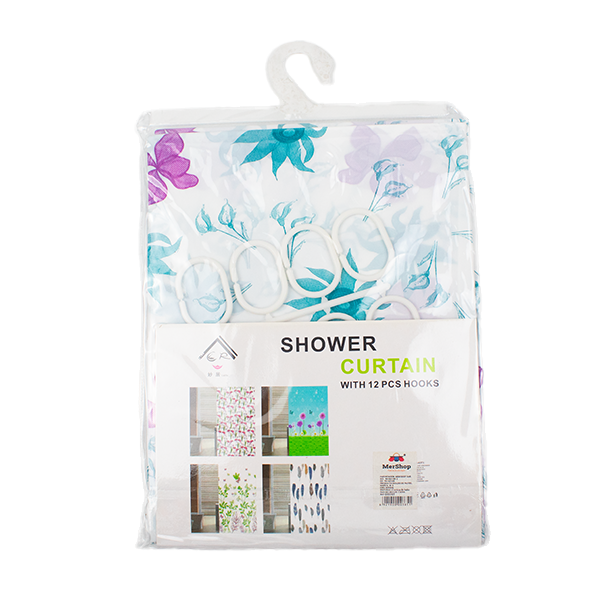 Cortina con estampados de gotas de agua y flores. Material: Plástico Color: Blanco, azul, verde.