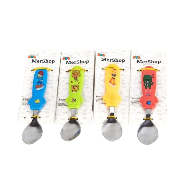 Cuchara para niños, cuenta con mango estampado. Material: Metal, plástico Color: Verde, azul, amarillo, rojo.